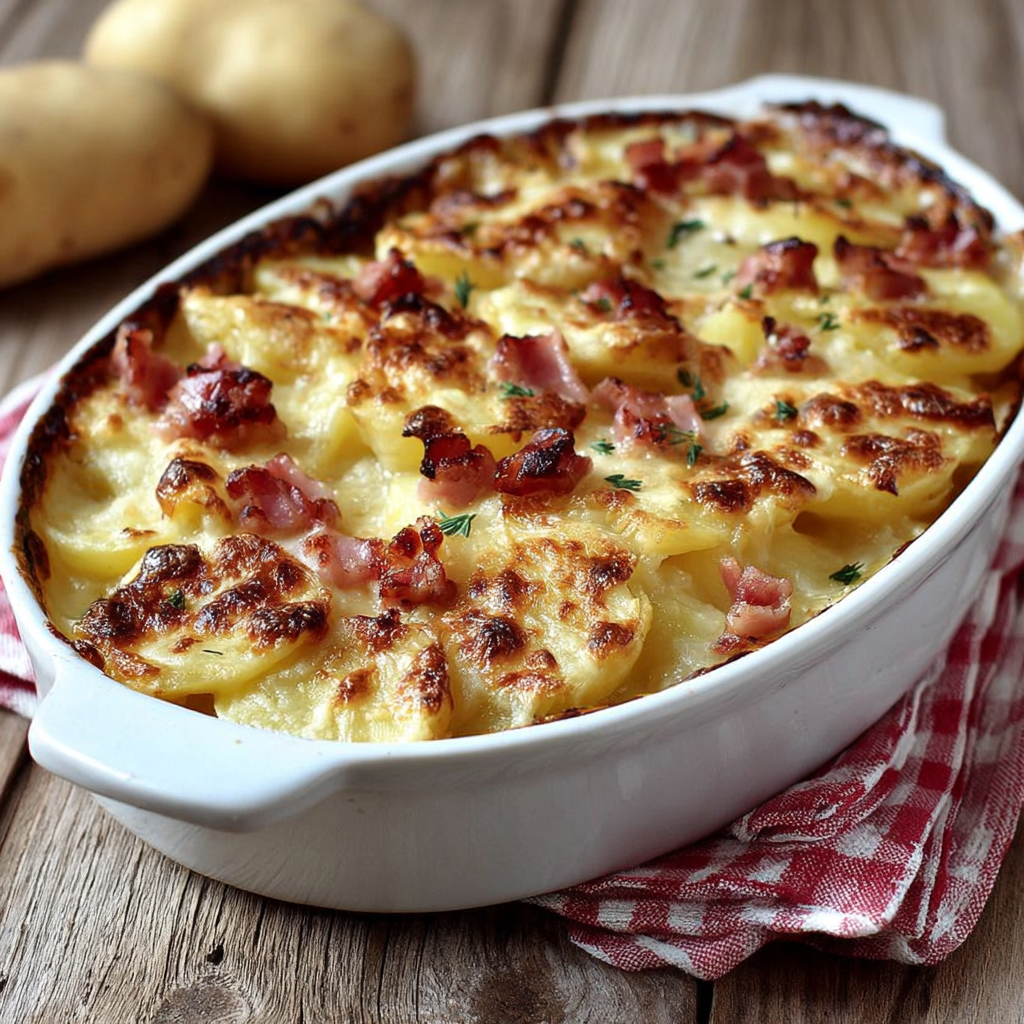 Avec des ingrédients basiques que l’on trouve dans toutes les cuisines, ce gratin transforme de simples pommes de terre en un plat crémeux, doré et parfumé. L’ajout des lardons apporte une touche fumée irrésistible qui relève le goût du gratin sans le rendre lourd.