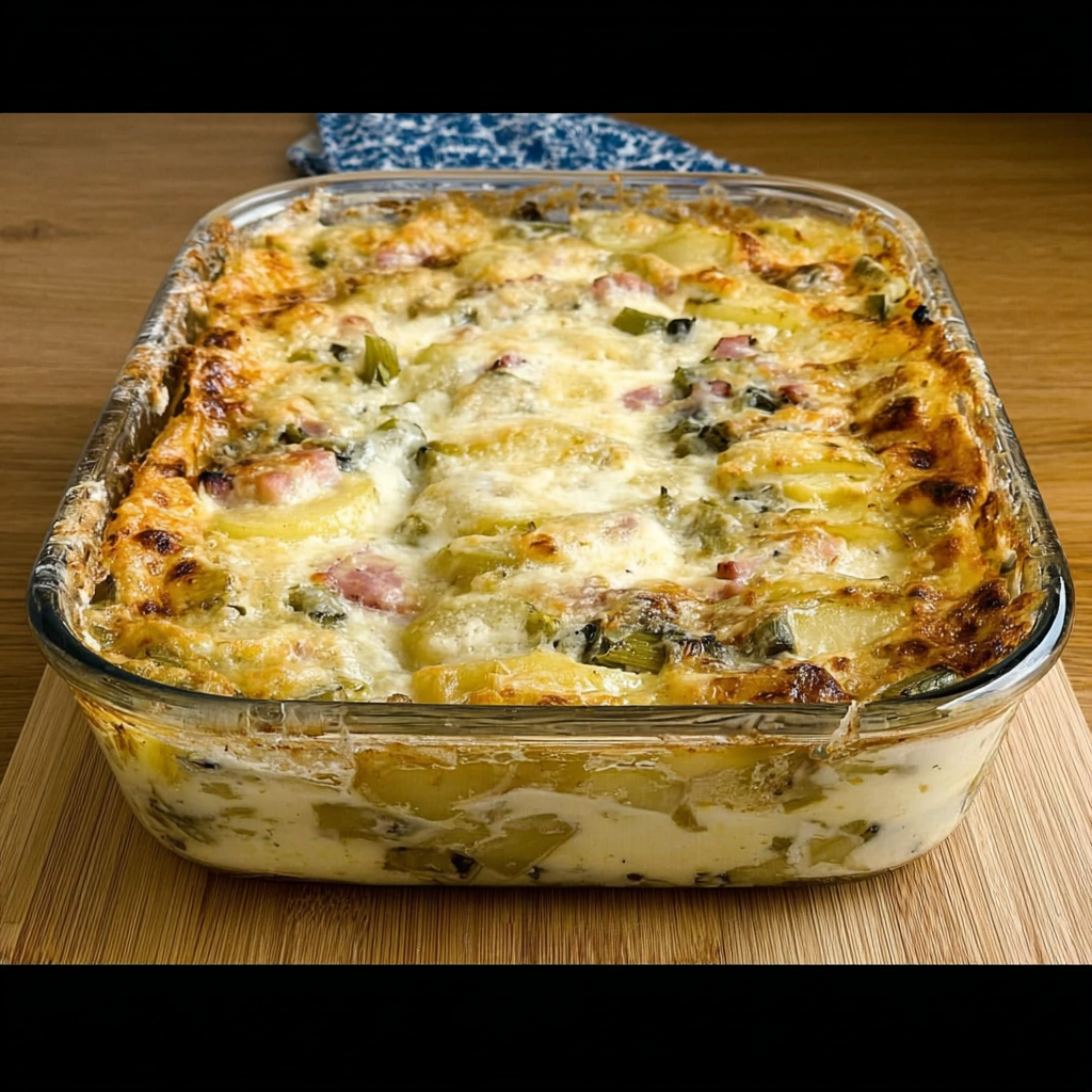 Le gratin de pommes de terre fait partie de ces plats intemporels qui réchauffent les cœurs et rassemblent autour de la table. C’est une recette généreuse, simple, nourrissante et profondément ancrée dans la cuisine familiale. Lorsqu’on y ajoute des poireaux fondants et des lardons fumés, on obtient un plat encore plus savoureux, où se mêlent douceur, onctuosité et caractère.
