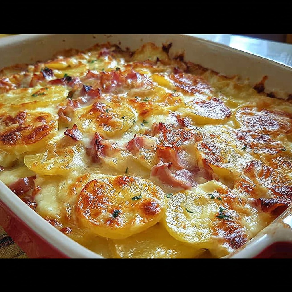 Gratin de pommes de terre crémeux à la cancoillotte et au jambon succulent