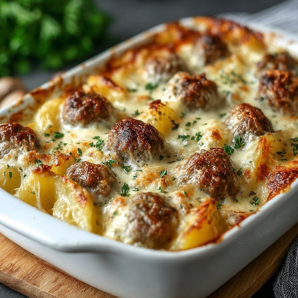 Le gratin est cuit à température modérée jusqu’à ce que les pommes de terre soient tendres, la sauce crémeuse et le dessus doré. Une cuisson douce permet de préserver la texture fondante des pommes de terre et la jutosité des boulettes.