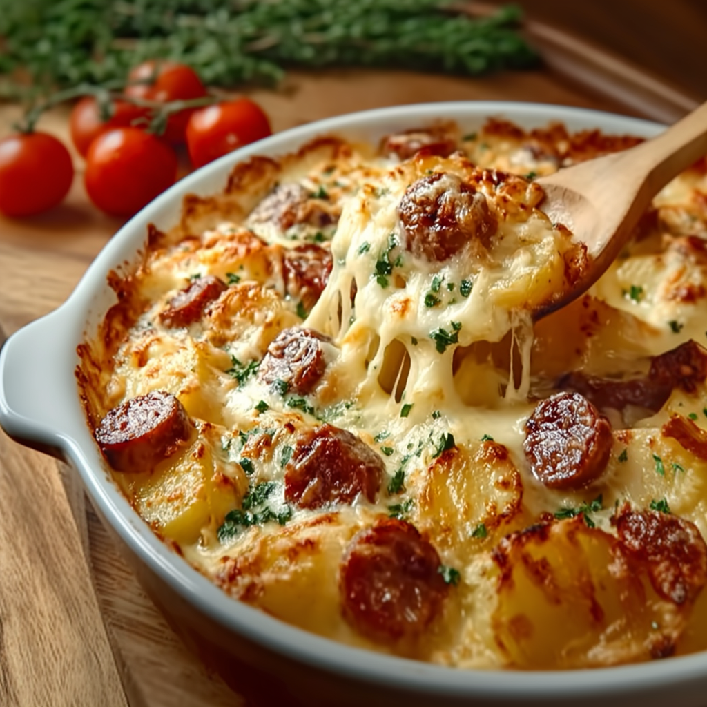 Le gratin de pommes de terre et saucisses est un plat généreux, réconfortant et profondément ancré dans la cuisine familiale. Il marie la douceur fondante des pommes de terre, la saveur rustique des saucisses et une sauce crémeuse qui enveloppe le tout sous une croûte dorée irrésistible. C’est le genre de plat qui rassemble tout le monde autour de la table et qui se prête aussi bien aux repas du quotidien qu’aux grandes tablées.