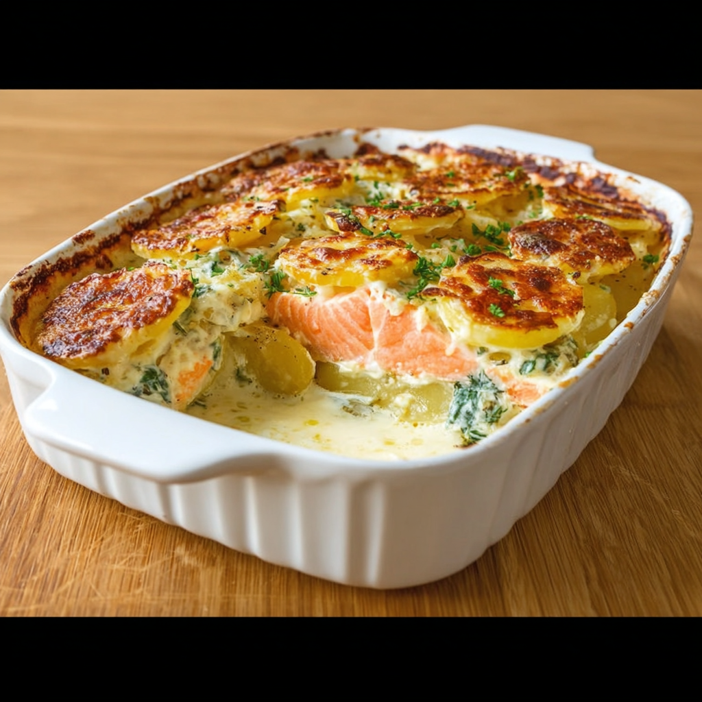 Le gratin de pommes de terre au saumon avec sauce béchamel est un plat généreux et réconfortant qui allie la douceur des pommes de terre fondantes, la richesse du saumon et l’onctuosité d’une béchamel maison. C’est une recette idéale pour un repas familial, un dîner convivial ou même un plat à préparer à l’avance.
