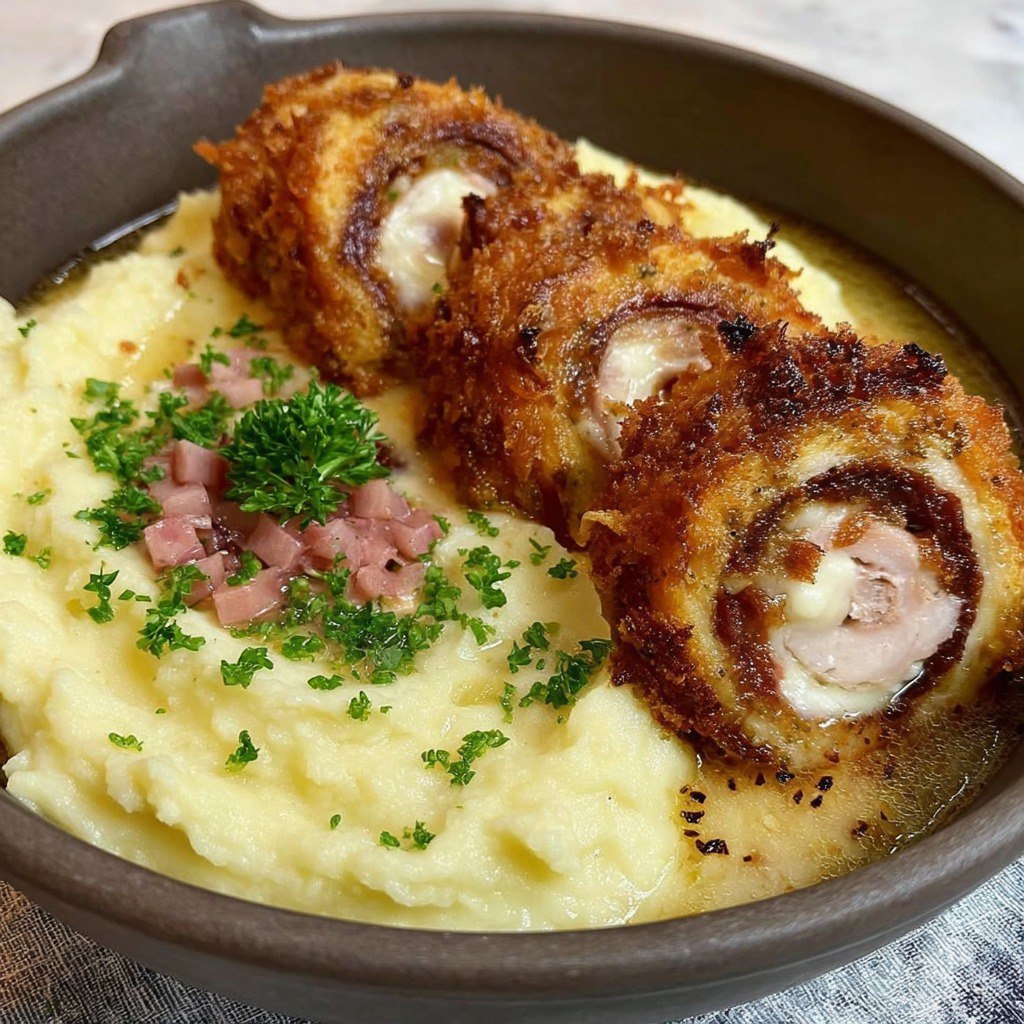 Ce plat généreux associe deux préparations classiques qui, ensemble, forment un repas familial à la fois réconfortant, équilibré et gourmand. D’un côté, une purée de pommes de terre maison, onctueuse et gratinée au four avec du fromage, et de l’autre, des filets de poulet délicatement farcis avec du jambon et du fromage fondant, puis cuits jusqu’à ce qu’ils soient tendres et dorés.