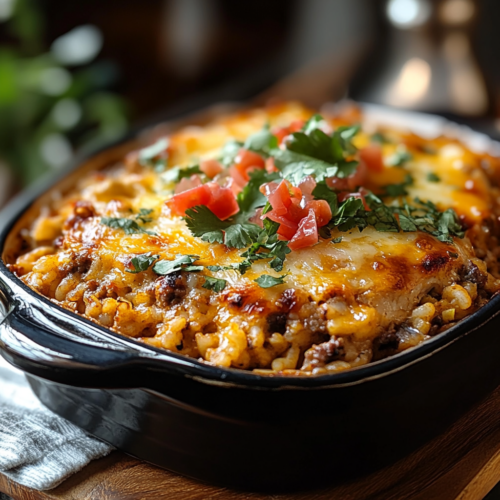 Ce gratin de riz à la viande hachée à la mexicaine est un plat réconfortant, savoureux et plein de saveurs épicées. Il combine la richesse de la viande hachée, l’onctuosité du fromage fondu et la fraîcheur des légumes dans un plat cuit au four, parfait pour toute la famille. La salsa, l’assaisonnement à tacos et le bouillon de poulet apportent une profondeur de saveur unique, tandis que le riz cuit doucement pour un repas complet et satisfaisant.