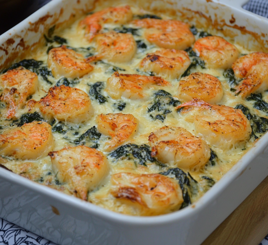 Gratin d’épinards crémeux et savoureux aux crevettes, alliant légèreté et gourmandise pour un repas équilibré.
