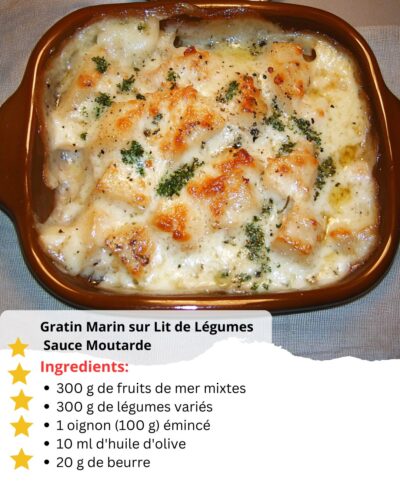 Ce Gratin Marin sur Lit de Légumes à la Sauce Moutarde combine la douceur des fruits de mer, la fraîcheur des légumes croquants et l’onctuosité d’une sauce crémeuse légèrement relevée à la moutarde.