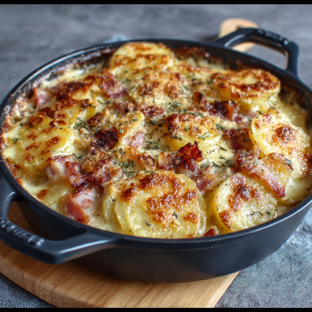 La recette marie plusieurs textures : les pommes de terre tendres, le bacon légèrement croquant et le fromage fondant, gratiné à souhait. Ce contraste de textures et de saveurs en fait un gratin irrésistible.