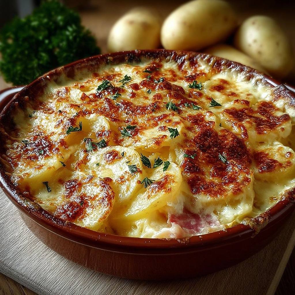 Enfin, ce gratin est un excellent exemple de plat familial et convivial, simple à préparer mais offrant une grande satisfaction gustative. Il peut être servi seul ou accompagné d’une salade, d’un potage léger, ou de légumes vapeur pour compléter le repas. Chaque bouchée offre un mélange parfait de textures et de saveurs : le fondant des pommes de terre, la tendreté du jambon, le crémeux du fromage et le croustillant de la chapelure sur le dessus. La simplicité des ingrédients combinée à la maîtrise de la cuisson transforme ce plat classique en un vrai moment de plaisir culinaire.
