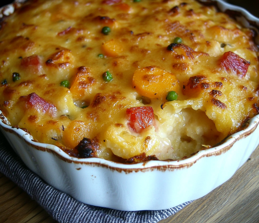 Gratin savoureux, alliant légumes fondants, dés de jambon et sauce crémeuse relevée pour un repas gourmand.