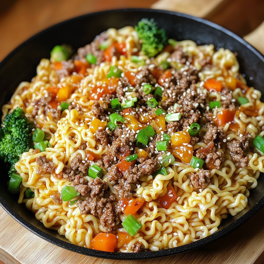 Si vous êtes à la recherche d’un plat rapide, simple et délicieux, alors cette recette de Ground Beef Ramen Skillet est exactement ce qu’il vous faut. Ce plat combine des nouilles ramen réconfortantes, du bœuf haché savoureux, et des légumes croquants comme le brocoli, le tout rehaussé par une sauce asiatique pleine de saveurs. C’est un repas parfait pour un dîner en semaine lorsque vous n’avez pas beaucoup de temps, mais que vous voulez quand même profiter d’un bon plat fait maison.