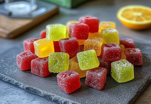 Ajoute un enrobage : mélange 2 cuillères à soupe de sucre avec une pincée d’acide citrique, puis roule légèrement les gummies dedans avant de les servir.
