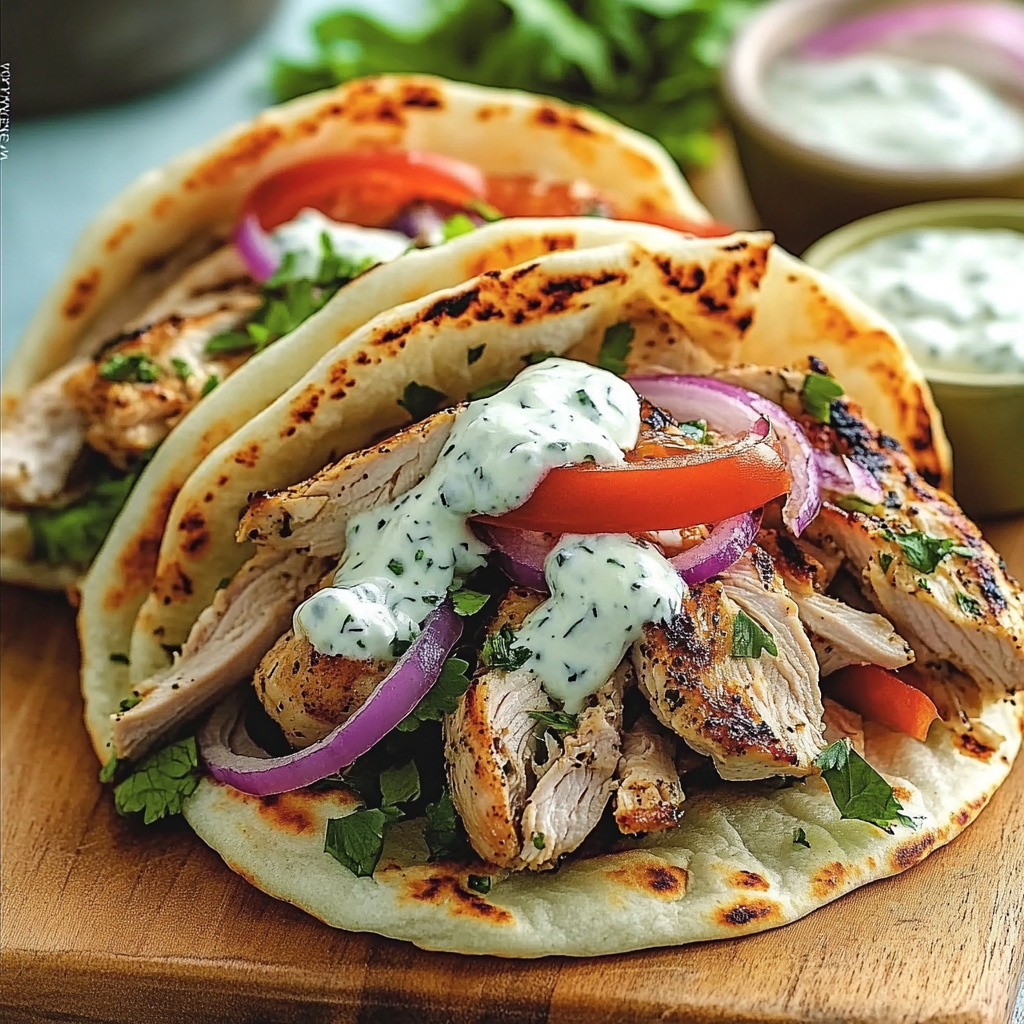 - Montage des Gyros : Étalez une généreuse quantité de sauce tzatziki sur chaque pita. Ajoutez des lanières de poulet, des tranches d’oignon rouge, des dés de tomate et une pincée de persil haché. Roulez les pitas en enveloppant bien la garniture.