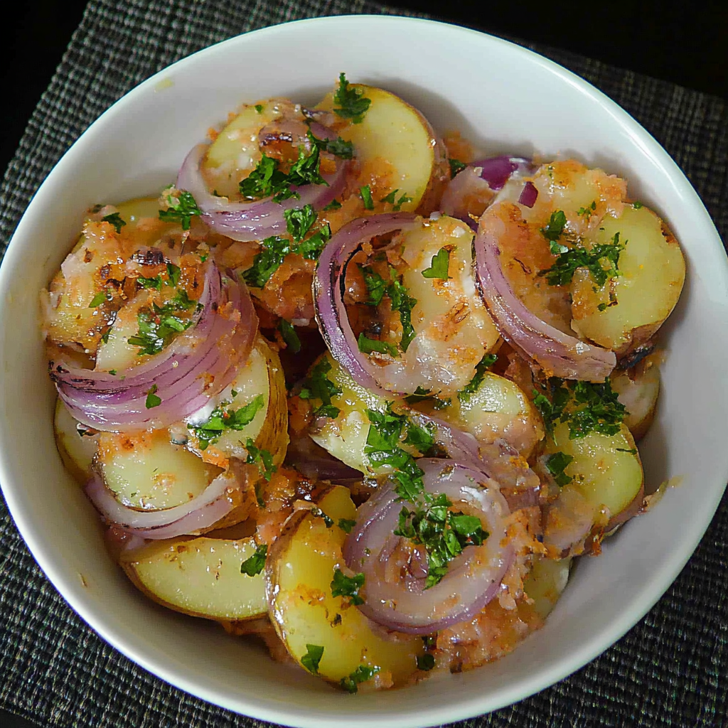 Pour une présentation appétissante, choisissez un plat de service qui met en valeur les couleurs naturelles des ingrédients. Une belle assiette blanche fera ressortir le rouge de l’oignon, le vert du persil et les teintes dorées des pommes de terre. -