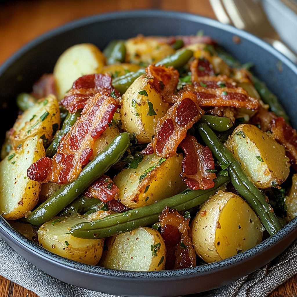 Ajouter les haricots verts et les assaisonnements : Incorporez les haricots verts, le mélange d’assaisonnement ranch, le thym et le romarin. Versez le bouillon de poulet et portez le mélange à ébullition. Couvrez la poêle, réduisez le feu à doux et faites cuire pendant environ 15-20 minutes, ou jusqu’à ce que les pommes de terre et les haricots verts soient tendres.
