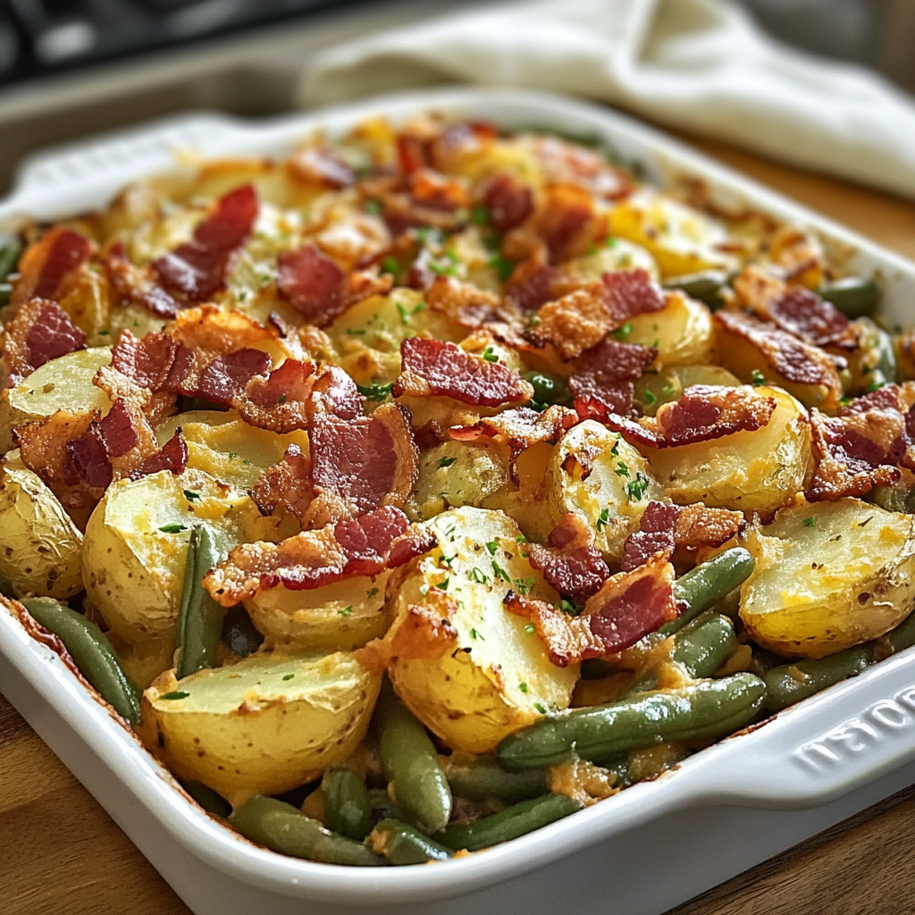Si vous cherchez une recette d’accompagnement simple mais gourmande qui ravira tous les palais, les Haricots Verts et Pommes de Terre à la Ranch avec Bacon sont un choix parfait. Ce plat combine des pommes de terre tendres, des haricots verts croquants, du bacon salé et un délicieux mélange de beurre ranch, créant ainsi une explosion de saveurs à chaque bouchée. Que ce soit pour un repas de famille, un dîner entre amis ou même un barbecue, ce plat sera un vrai succès !