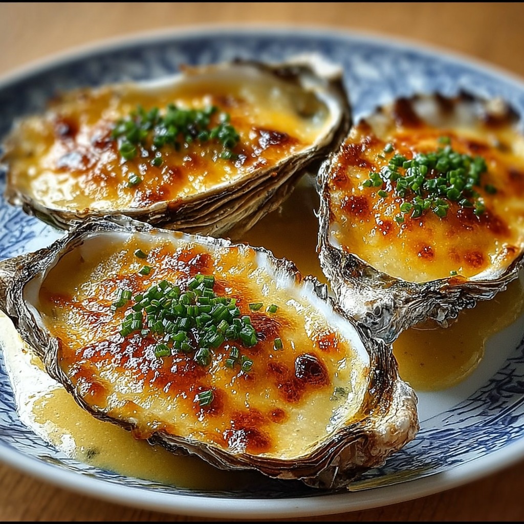 Douze huîtres fraîches, cent millilitres de champagne brut, deux cuillères à soupe de crème fraîche épaisse, cinquante grammes de beurre, une échalote finement hachée, cent grammes de fromage râpé (gruyère ou comté), une pincée de sel et de poivre, quelques brins de ciboulette ou de persil pour la décoration. Ces ingrédients permettent d’obtenir des huîtres gratinées à la fois délicates, parfumées et élégantes, mettant en valeur le goût iodé des fruits de mer.