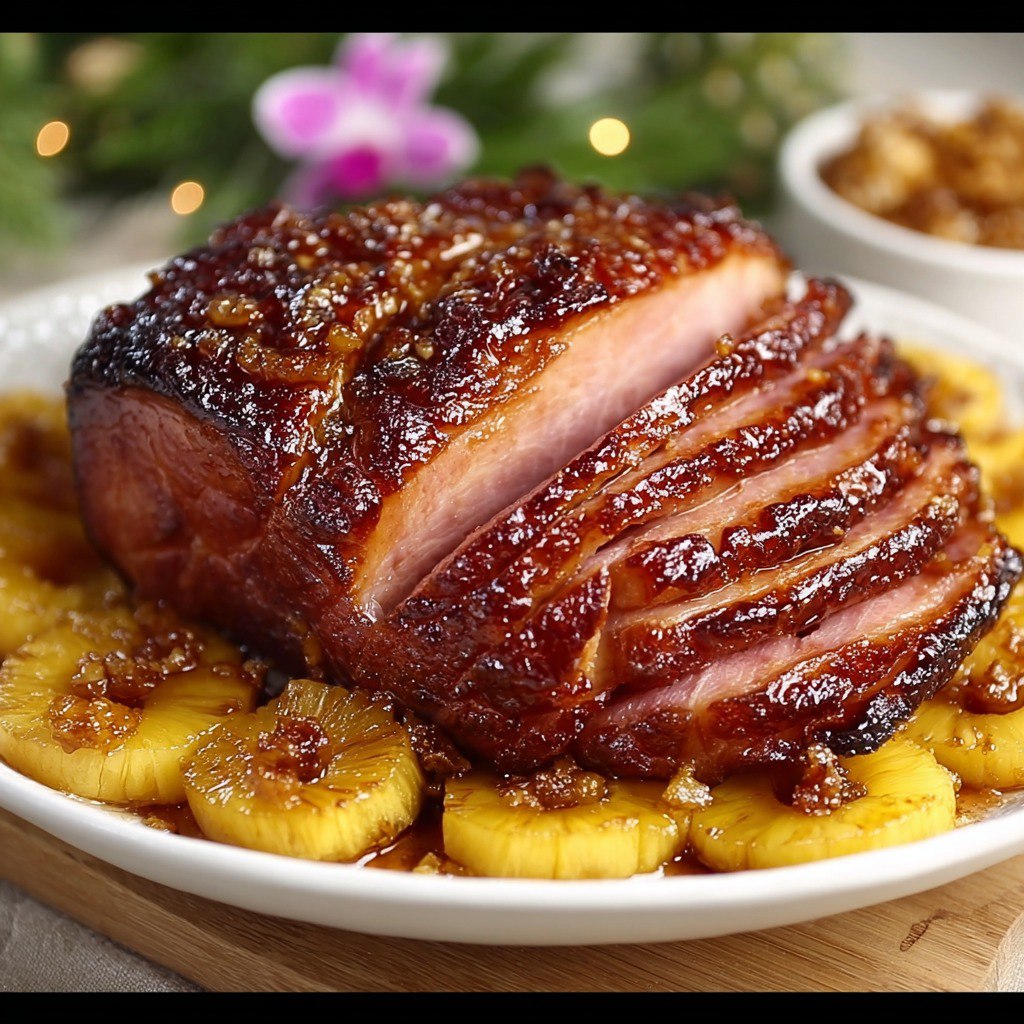 Le jambon glacé à l’ananas et à la cassonade est un classique de la cuisine familiale et festive. Il combine harmonieusement le salé du jambon, la douceur sucrée de la cassonade et la fraîcheur acidulée de l’ananas. Ce plat est souvent associé aux grandes occasions, aux repas de Noël, de Pâques ou à d’autres réunions de famille, car il a une apparence impressionnante tout en étant facile à préparer. Le glaçage donne une belle croûte caramélisée et parfumée qui plaît aux petits comme aux grands.