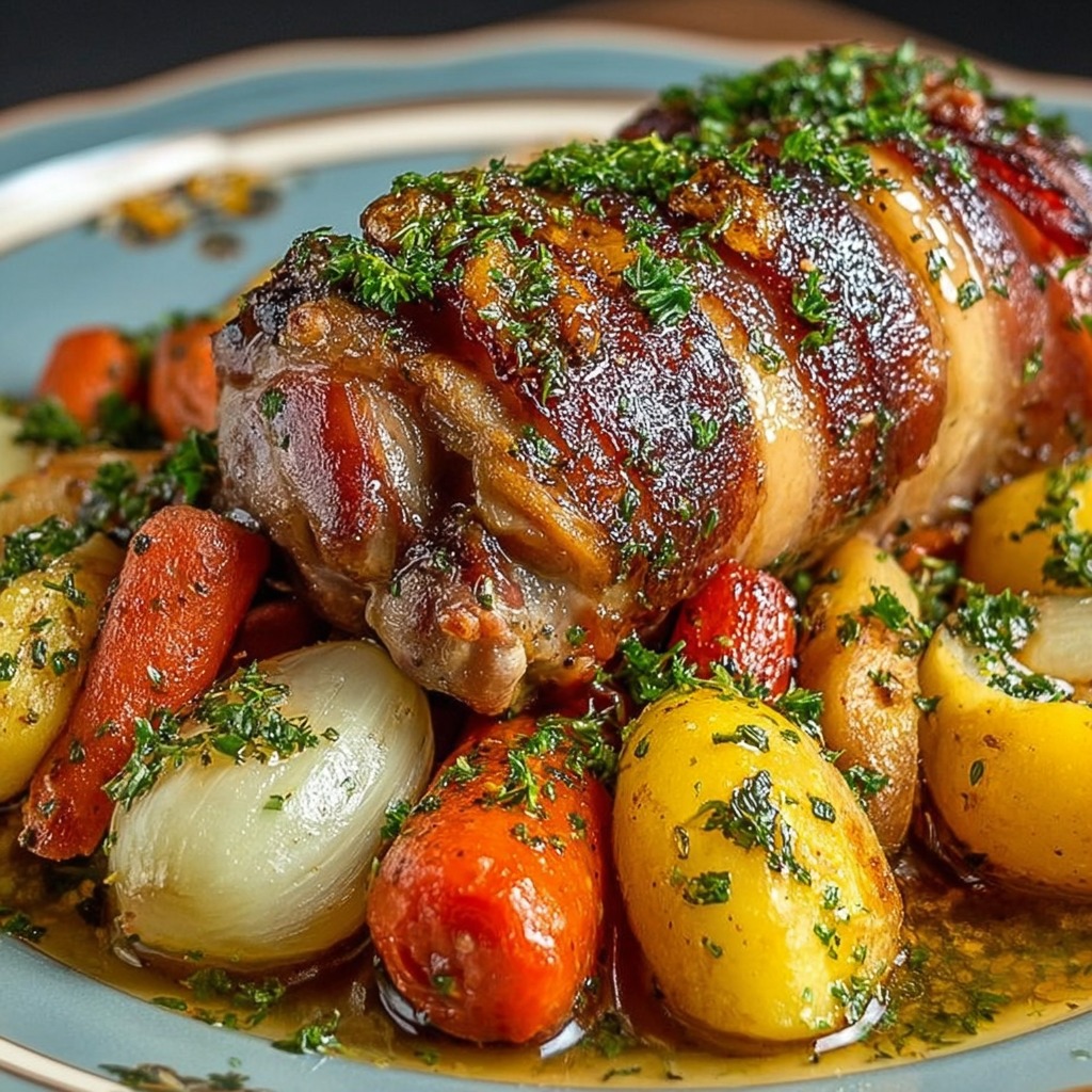 Le jarret de porc rôti aux légumes est un plat emblématique de la cuisine traditionnelle, symbole de générosité et de cuisson lente maîtrisée. Il évoque les repas familiaux, les tables conviviales et les recettes transmises de génération en génération. Ce plat repose sur une pièce de viande rustique, longuement cuite, accompagnée de légumes fondants imprégnés des sucs de cuisson.