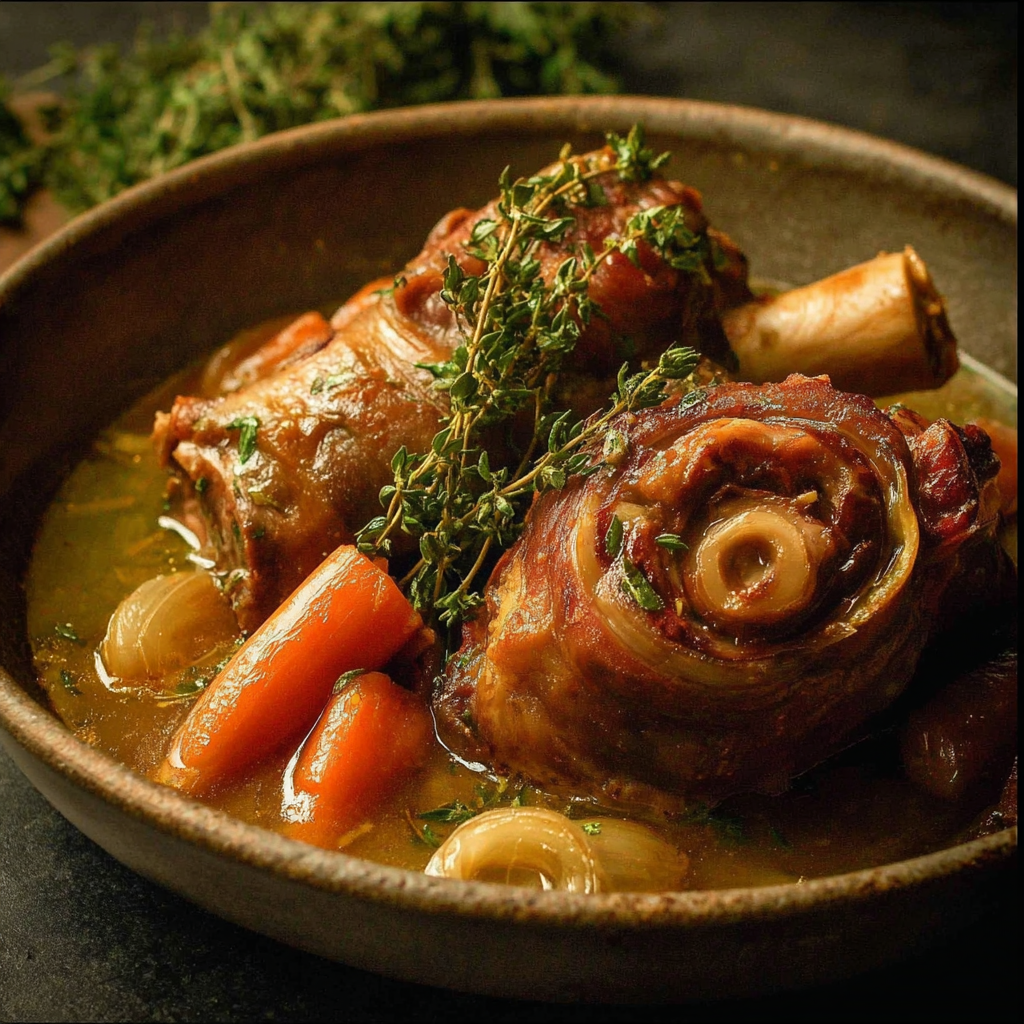Il existe des plats qui ne sont pas seulement des recettes, mais de véritables souvenirs. Le jarret de veau braisé fait partie de ces trésors culinaires transmis de génération en génération. Il évoque les dimanches midi, les grandes tables familiales, la cuisine qui embaume toute la maison dès le matin, et cette cocotte qui mijote lentement pendant que le temps semble suspendu.