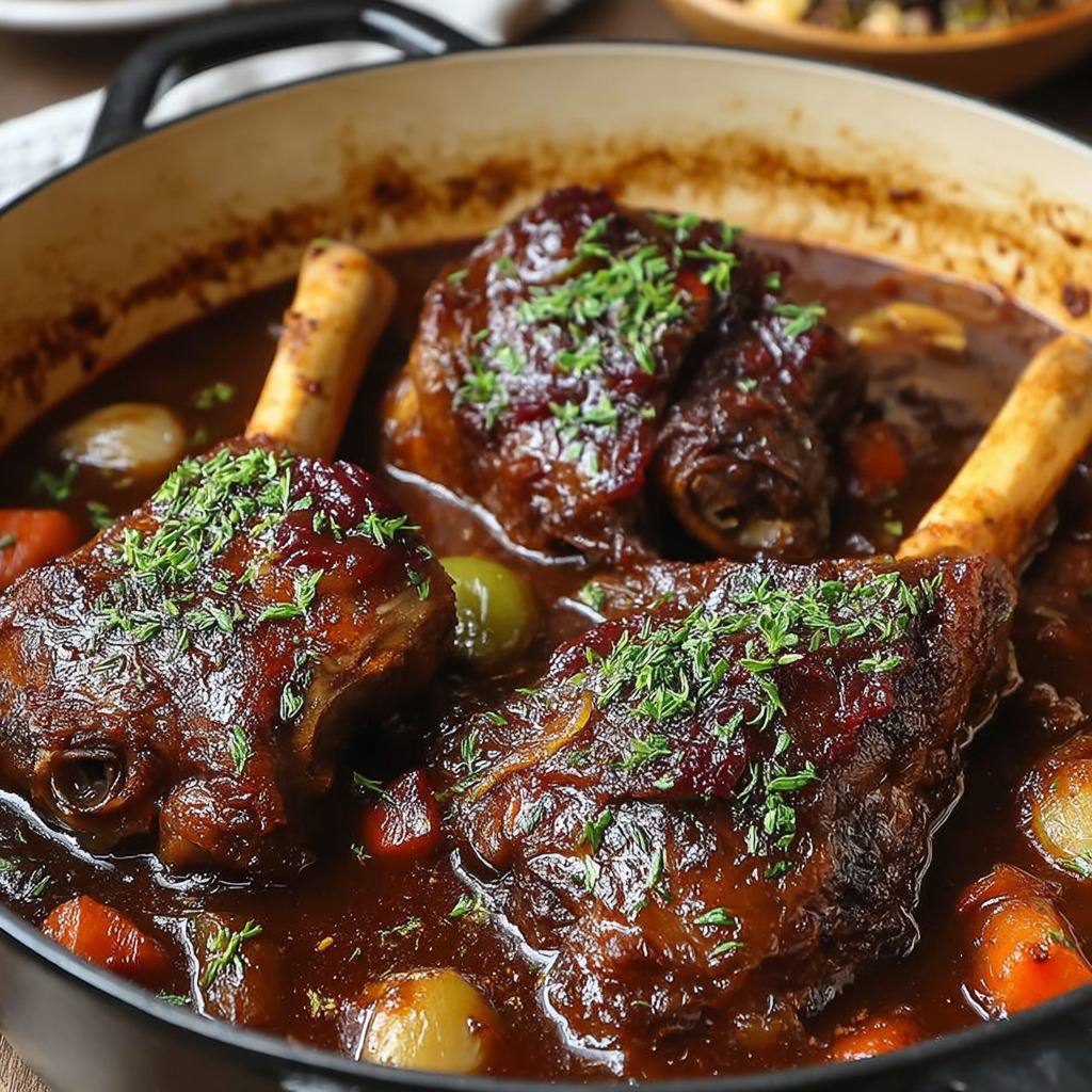 En conclusion, les jarrets d’agneau braisés au vin rouge représentent bien plus qu’un simple plat. Ils sont le symbole d’une tradition culinaire riche, héritée des générations passées et adaptée aux goûts contemporains. Leur préparation demande du temps, de l’attention et de la passion, mais le résultat en vaut largement la peine. Fondants, parfumés et enveloppés d’une sauce profonde et onctueuse, ils incarnent la générosité de la table française et rappellent à chacun que la véritable gastronomie est une affaire de patience, de respect et de plaisir partagé.