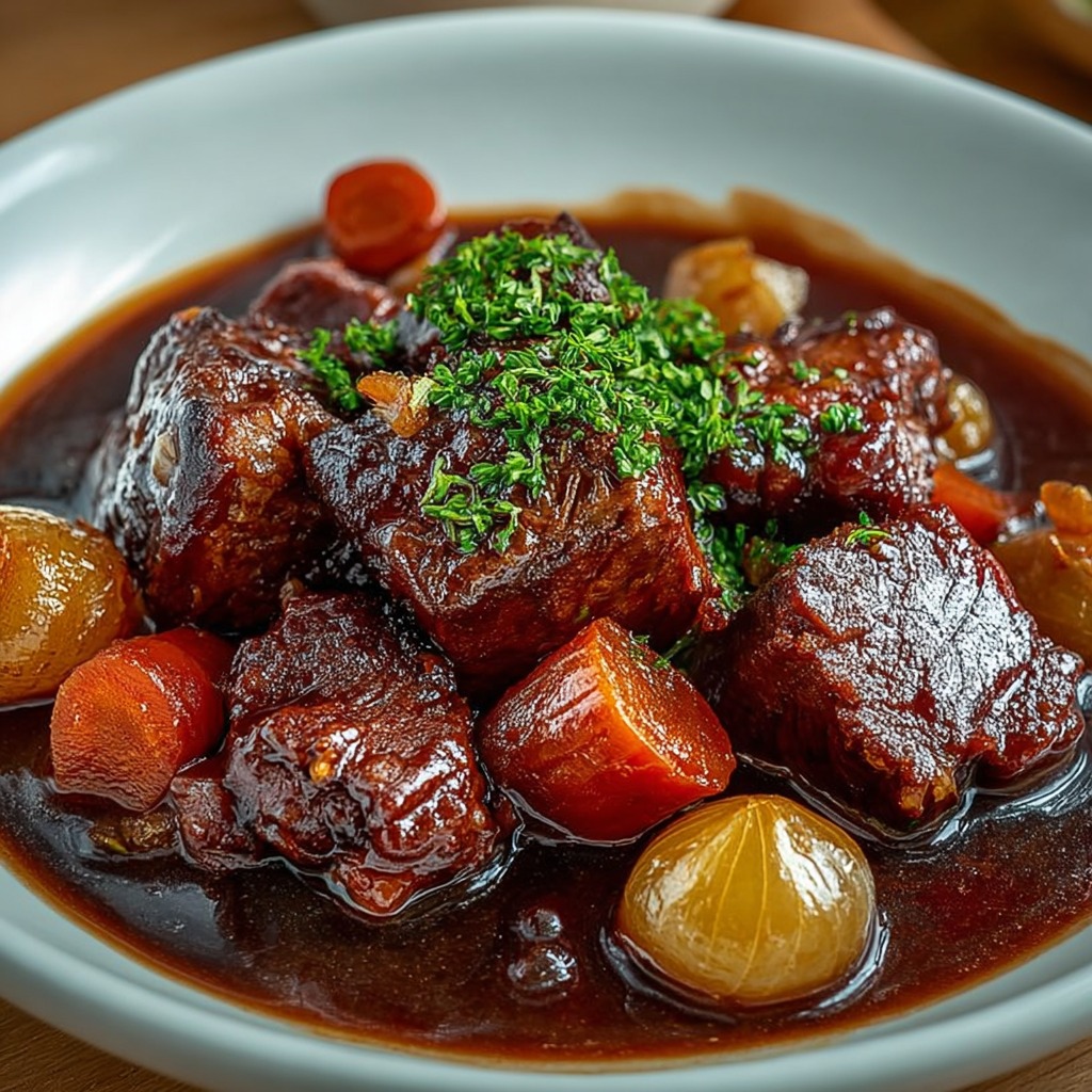 La joue de bœuf braisée au vin rouge et carottes fondantes est un plat raffiné et généreux qui allie tendreté de la viande, douceur des légumes et richesse aromatique de la sauce. Longuement mijoté, il révèle des saveurs profondes et équilibrées, incarnant parfaitement l’art de la cuisine française traditionnelle. Ce plat réconfortant et convivial transforme chaque repas en une expérience gusta
