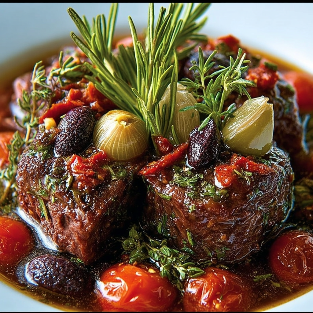Les tomates et l’ail apportent acidité et douceur pour équilibrer la richesse de la viande.