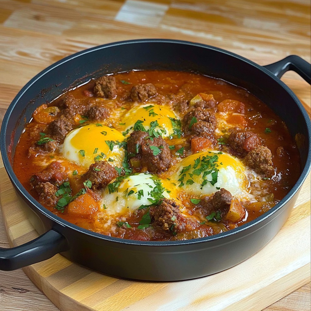 Inspirée de la kefta maghrébine ou encore des œufs à la turque façon shakshuka, cette recette incarne la fusion parfaite entre épices, douceur des œufs et fraîcheur des herbes. Prête en 25 minutes, elle convient aussi bien aux soirs pressés qu’aux repas conviviaux.