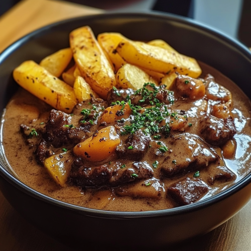 La carbonade flamande se sert chaude, accompagnée de frites maison ou d’une purée de pommes de terre. Vous pouvez également ajouter une petite salade verte pour équilibrer le plat.