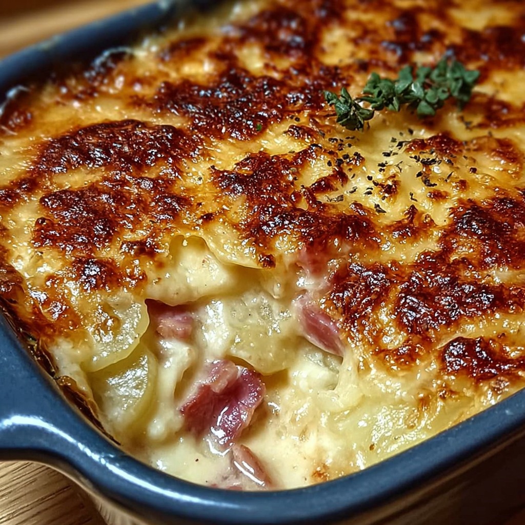 Les poireaux cuits lentement dégagent une saveur douce et légèrement sucrée qui contraste avec le goût salé et fumé du jambon. Le fromage à raclette ajoute une richesse lactée et fondante qui complète parfaitement la béchamel épicée de noix de muscade. Le sel et le poivre sont dosés pour relever le goût sans dominer les saveurs naturelles des légumes et de la viande. L’ensemble crée un gratin équilibré, savoureux et gourmand.