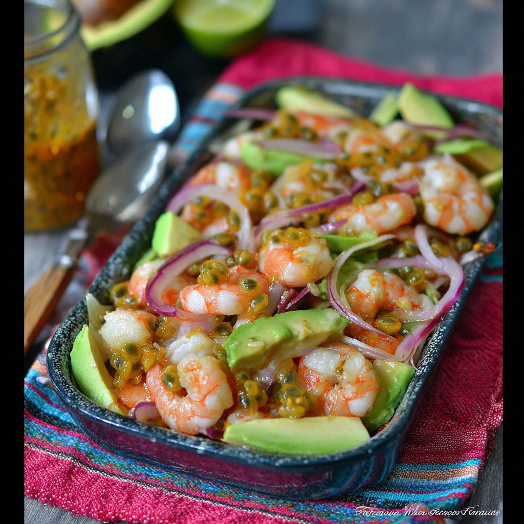 Le fenouil cru offre une texture croquante et une légère saveur anisée qui contraste agréablement avec la douceur de l’avocat et la salinité des crevettes. L’oignon rouge apporte une note piquante modérée et une belle couleur. Le fruit de la passion, avec son jus acidulé et légèrement sucré, crée un équilibre frais et exotique. L’huile d’olive liesse les saveurs tout en apportant une texture lisse. Le citron active la fraîcheur globale du plat.