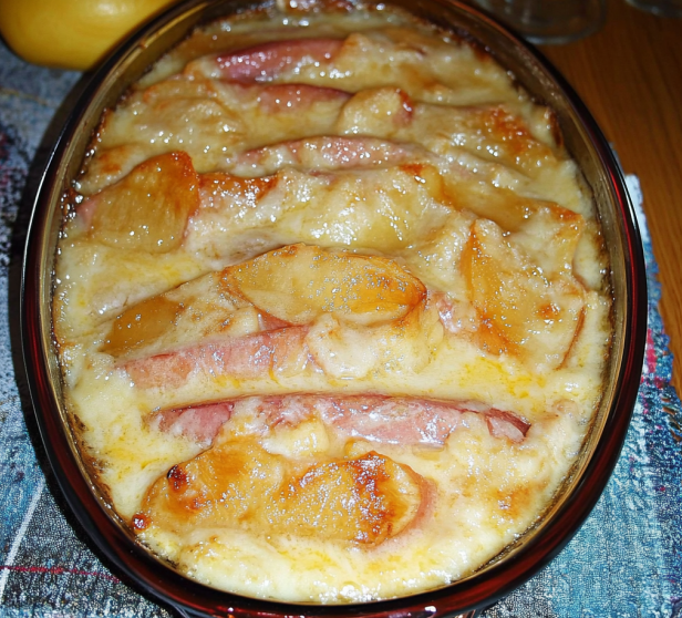 - Coupez le reblochon en tranches et déposez-les sur le dessus, croûte vers le haut.