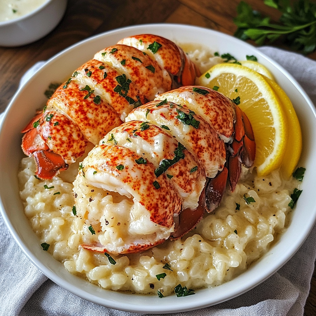 2. Ajoutez la langouste : Garnissez le risotto avec les queues de langouste poêlées.