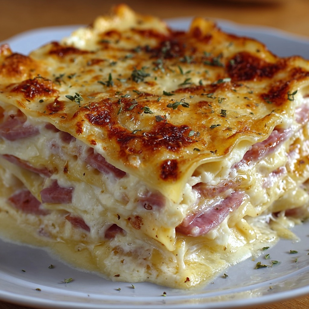 Ces lasagnes allient simplicite et gourmandise. La combinaison du jambon, du fromage et de la sauce cremeuse offre un plat riche et moelleux, ideal pour les repas conviviaux e