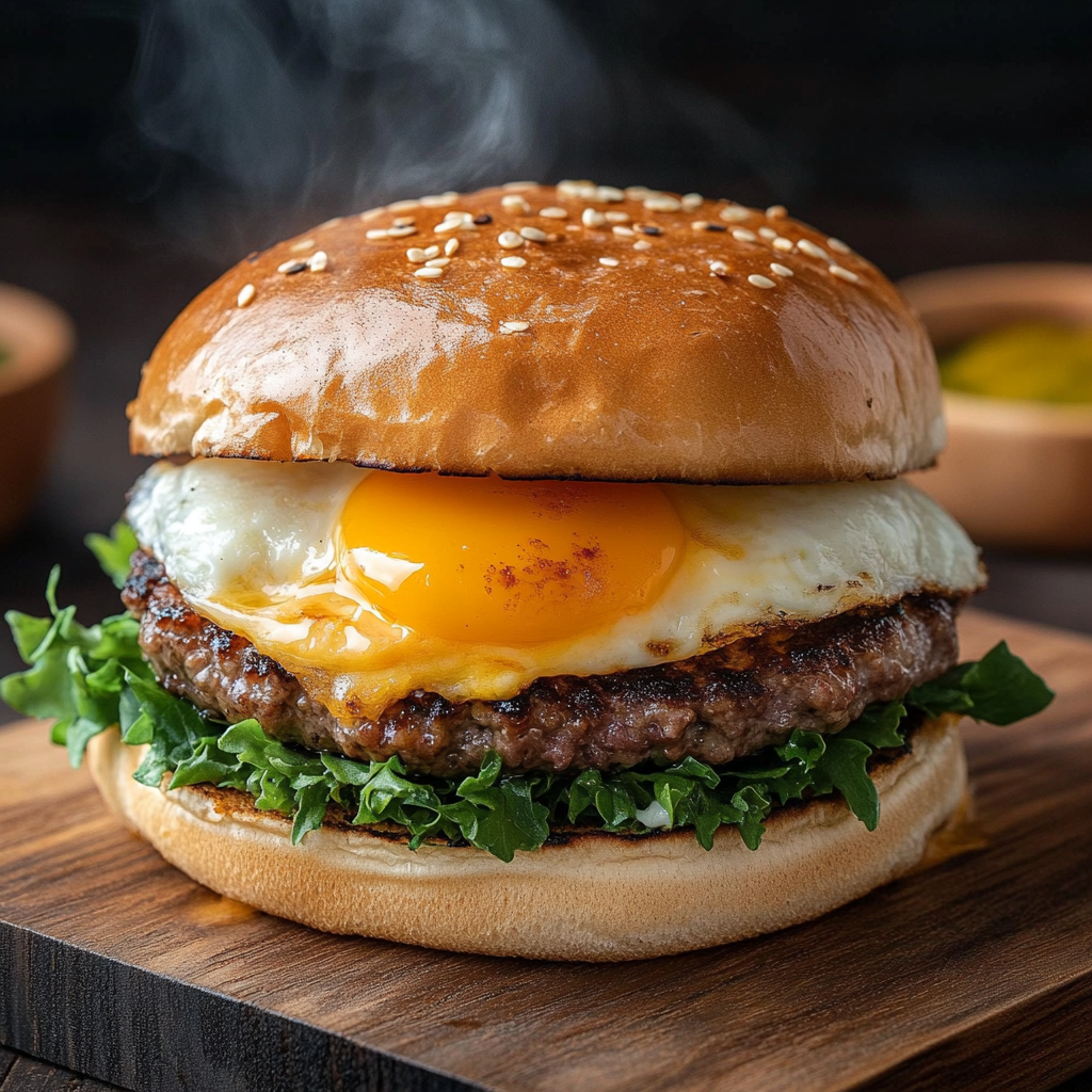 Le Burger à l’œuf coulant est une recette gourmande qui combine un œuf au plat coulant, du bacon croustillant et du fromage fondant, le tout servi dans un pain moelleux. Ce burger offre une explosion de saveurs et de textures qui raviront vos papilles.