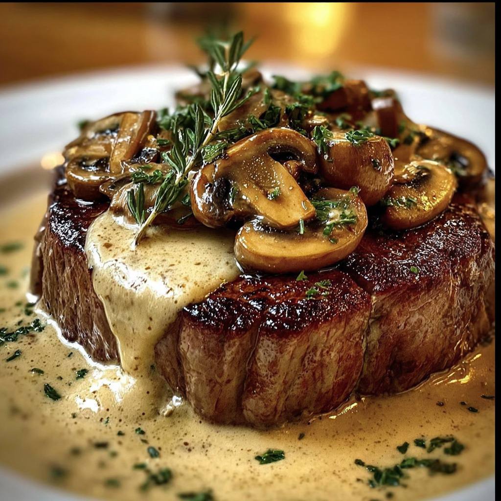Pour servir, on dispose les steaks dans les assiettes, puis on nappe généreusement avec la sauce aux champignons. On peut décorer avec quelques brins de thym frais pour une touche élégante et aromatique.