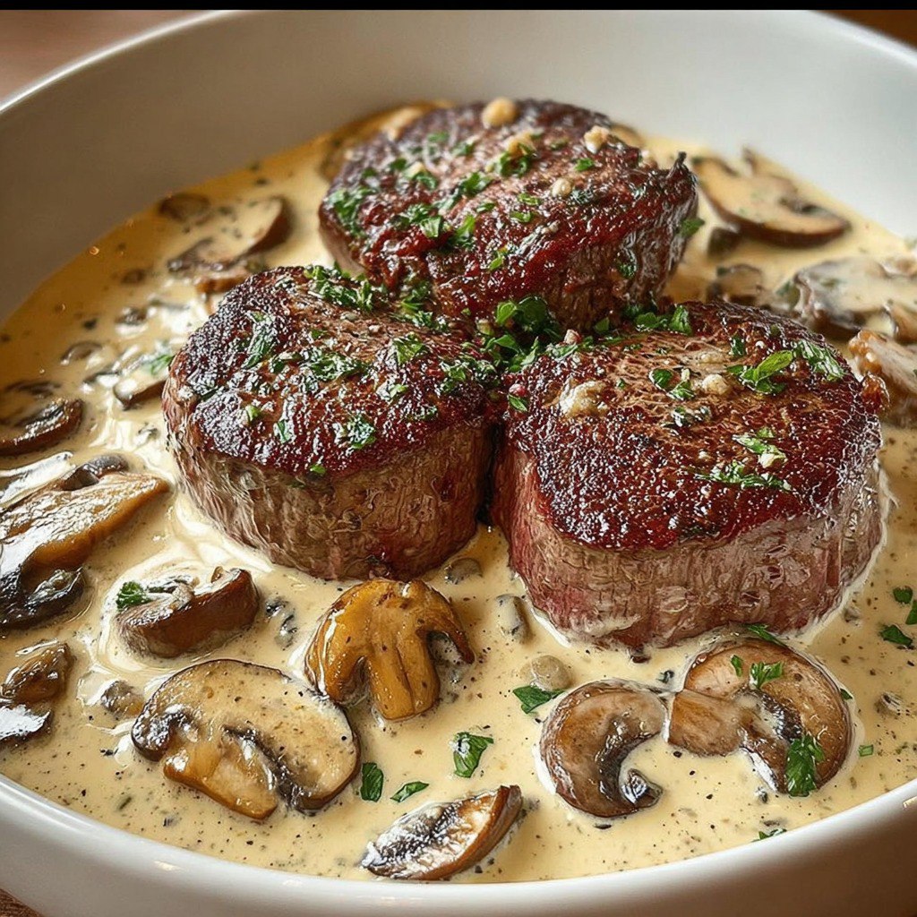 Pour une belle présentation, disposez les morceaux de filet mignon nappés de sauce sur un plat de service. Ajoutez les champignons en garniture. Accompagnez de légumes verts sautés ou d’une purée maison. Ce plat peut également être présenté dans des assiettes individuelles, décoré d’un peu de persil frais ou de ciboulette ciselée.