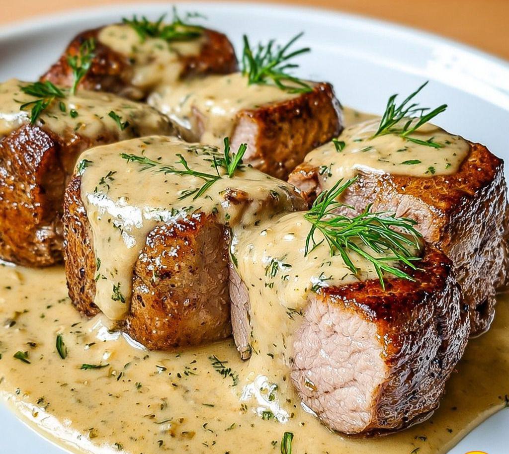 Servez les médaillons nappés de sauce dans un plat, et parsemez d’aneth frais pour ajouter une touche de fraîcheur et de couleur. Ce plat peut être accompagné de pommes de terre vapeur, de riz ou de légumes sautés, qui absorbent parfaitement la sauce et complètent le repas.