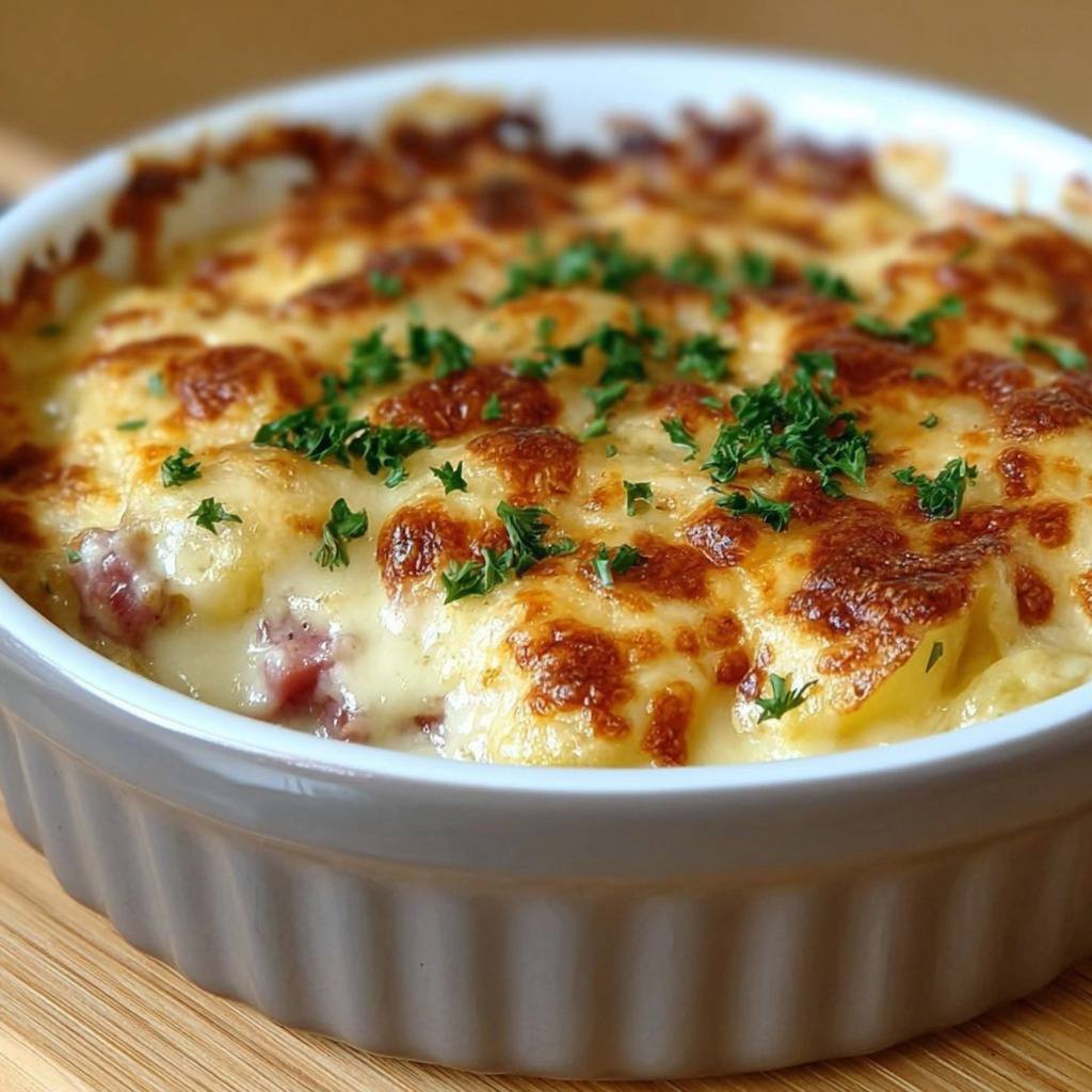 Cette recette peut également être adaptée selon les goûts. Le jambon fumé peut être remplacé par du blanc de poulet effiloché, du saumon, ou encore des légumes grillés pour une version végétarienne. Les fromages peuvent être changés en fonction des préférences ou de ce que l’on a dans le réfrigérateur : emmental, bleu, raclette ou chèvre s’invitent facilement dans la recette. Il est également possible d’ajouter des oignons émincés ou des champignons poêlés entre les couches de pommes de terre pour enrichir le goût du gratin.