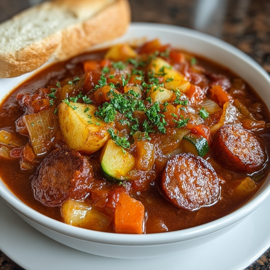 Le ragoût rustique aux saucisses, poivrons et courgettes