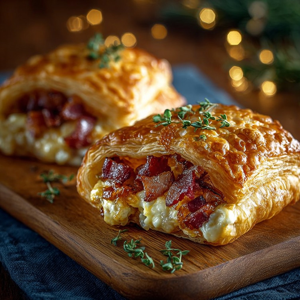 Servir les feuilletés chauds ou tièdes, accompagnés d’une salade verte croquante ou d’un mesclun légèrement vinaigré. Ils peuvent également être présentés sur un plateau apéritif avec d’autres bouchées feuilletées, comme des mini-quiches ou des roulés au fromage. Leur arôme irrésistible attire immédiatement les convives et leur texture croustillante contraste agréablement avec la garniture moelleuse et parfumée.