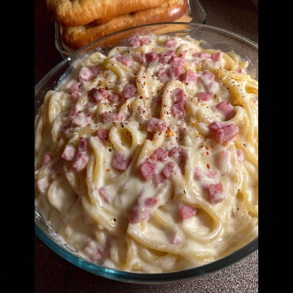 Le jambon est découpé en dés ou en lanières régulières. Cette découpe permet une répartition homogène dans les pâtes et assure que chaque portion contienne une quantité équilibrée de jambon. Il est ajouté en fin de cuisson afin de préserver sa tendreté et d’éviter qu’il ne sèche.