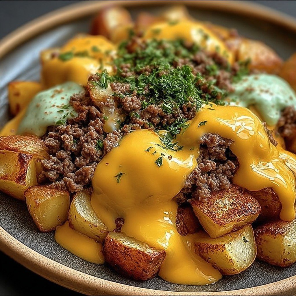 Ce n’est pas un plat de haute cuisine complexe, mais plutôt un chef-d’œuvre de la cuisine familiale, accessible à tous et capable de transformer une soirée ordinaire en un moment de pur plaisir gourmand. Il combine la rusticité des pommes de terre dorées et croustillantes, la richesse savoureuse de la viande hachée assaisonnée, et l’opulence décadente d’une sauce au fromage cheddar fondante. Chaque bouchée est une explosion de saveurs, un mélange parfait de salé, de crémeux et de terreux, couronné par la fraîcheur vibrante de la ciboulette.