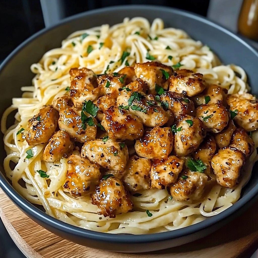 Linguine Crémeux au Parmesan avec Bouchées de Poulet Citron-Ail