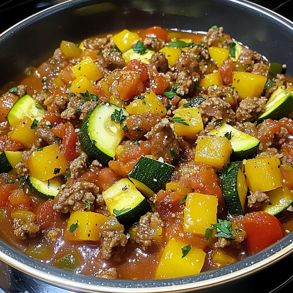 • Stir in the chopped zucchini, yellow squash, and canned petite diced tomatoes. The fresh vegetables add texture and nutrition, while the tomatoes provide a tangy base for the goulash. Season the mixture with pink sea salt and pepper to taste, adjusting the seasoning as needed.