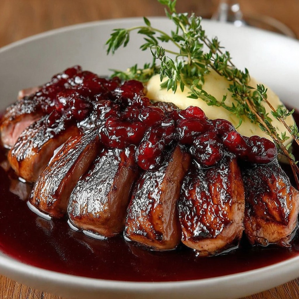 Le magret de canard laqué accompagné d’une sauce cerise et d’une purée onctueuse est un plat élégant et raffiné, emblématique de la gastronomie française. Il combine la richesse et le croustillant de la peau du canard avec la douceur acidulée des cerises et la tendreté d’une purée veloutée. La réussite de cette recette repose sur la cuisson précise du magret, la préparation équilibrée de la sauce et la texture crémeuse de la purée.