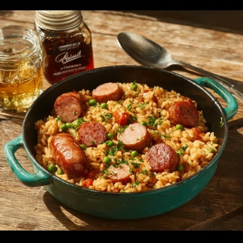 Dans cette recette, le riz absorbe les sucs de cuisson de la saucisse de Toulouse, tandis que les lardons apportent une note fumée et les petits pois une touche de douceur et de couleur. Le résultat est un plat équilibré, nourrissant et très convivial.