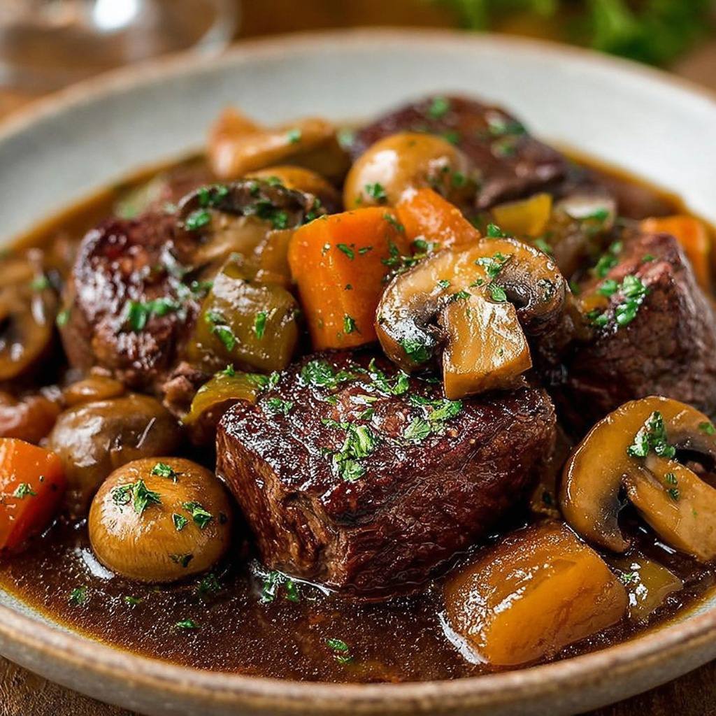 Cette recette peut être adaptée en fonction des saisons et des envies. Par exemple, vous pouvez remplacer les champignons de Paris par des cèpes ou des girolles en automne, pour une version encore plus parfumée. Pour une touche sucrée-salée, ajoutez quelques éclats de noisettes grillées ou une cuillère à café de confit d’oignons à la sauce. Si vous souhaitez une version sans vin, vous pouvez remplacer le vin rouge par du bouillon de légumes ou un mélange de jus de raisin rouge non sucré et de vinaigre balsamique. Le goût sera différent mais tout aussi savoureux.