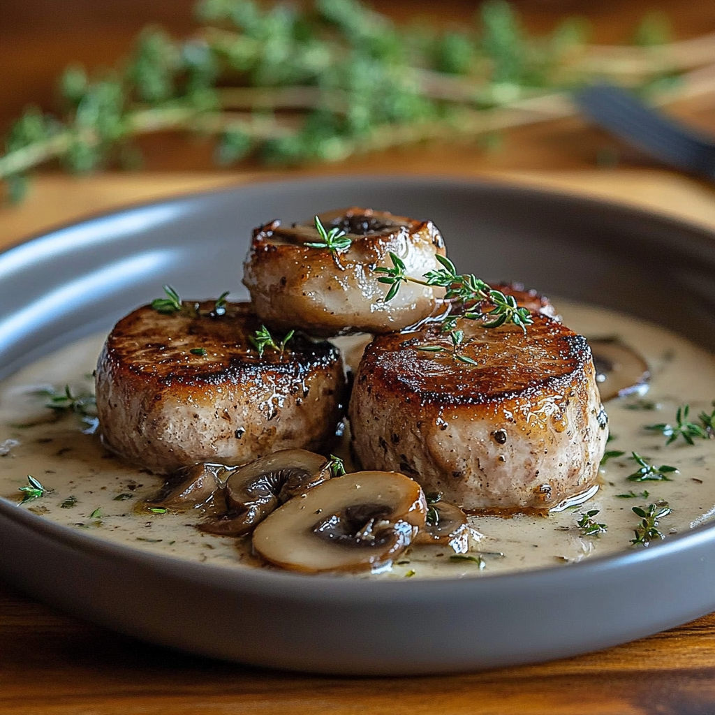Ce plat se compose de filet de porc, coupé en médaillons, qui sont dorés puis cuits au four pour garantir une cuisson parfaite. Ils sont ensuite accompagnés d’une sauce crémeuse à base de champignons frais, de vin blanc sec, de crème légère, et d’un peu de pesto au basilic pour une touche de fraîcheur. Le tout est parfumé avec de l’ail et du thym, ce qui donne une profondeur de saveur incomparable.