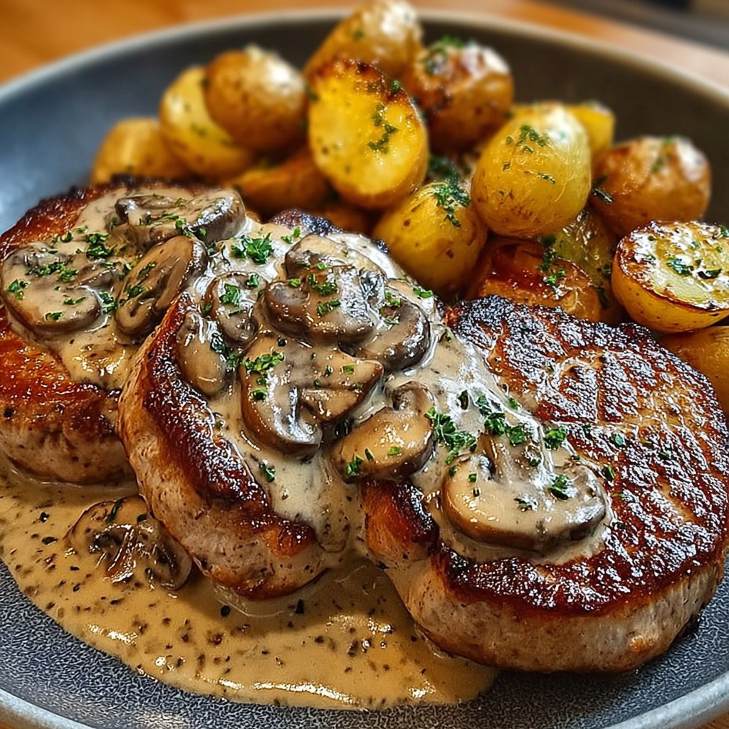 **Médaillons de porc sauce aux champignons et pommes de terre rôties**