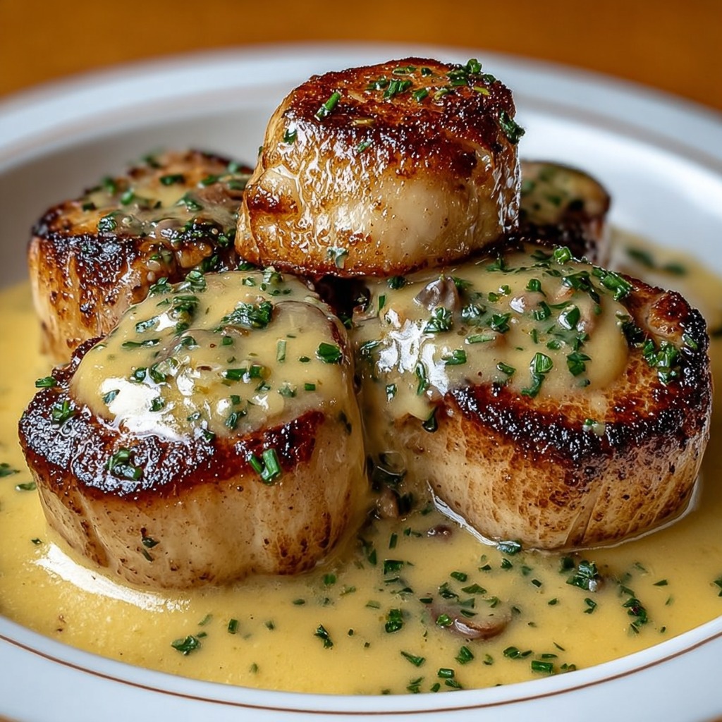 Le persil frais finement hache est ajoute en fin de cuisson pour apporter fraicheur et couleur. Les medaillons sont dresses harmonieusement puis nappes de sauce aux champignons. La presentation doit rester simple et elegante afin de mettre en valeur la qualite des ingredients.